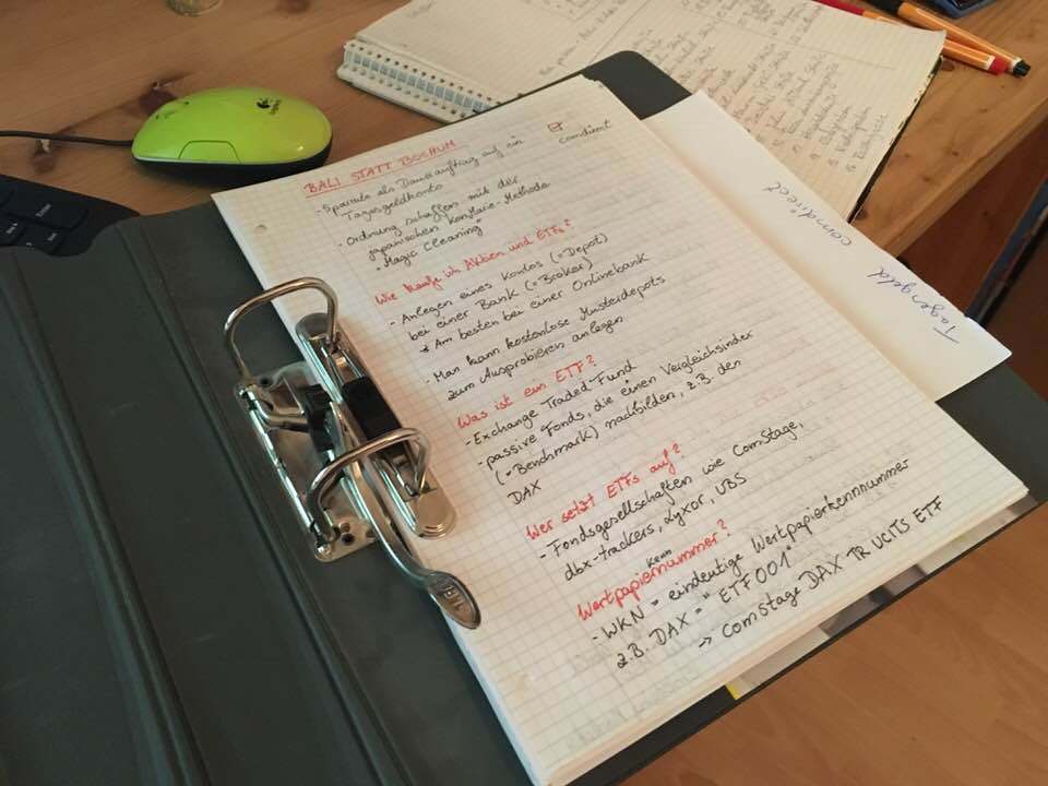 2. Sorry, für den Fachausdruck! Ein ETF ist ein Exchange Traded Fund, also ein Paket vieler, verschiedener Aktien. Zum Beispiel kannst du einen ETF kaufen, der Aktien der stärksten deutschen Unternehmen beinhaltet (DAX). Du musst dann gar nicht aktiv an der Börse handeln, sondern der ETF wird immer wieder aktualisiert und du kannst das Geld einfach 15 oder 20 Jahre lang für dich arbeiten lassen. 🙂