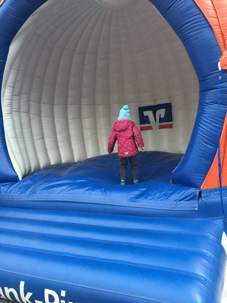 Wir waren ziemlich allein auf dem Fest, was den Vorteil hatte, dass wir schnell unser Langos bekamen und die Kinder viel auf der Hüpfburg springen konnten. Sie holten sich auch Zuckerwatte und bekamen Kuchen vom Kuchenstand. Hier verkauften gerade meine Mama und eine Freundin für den Sportverein.