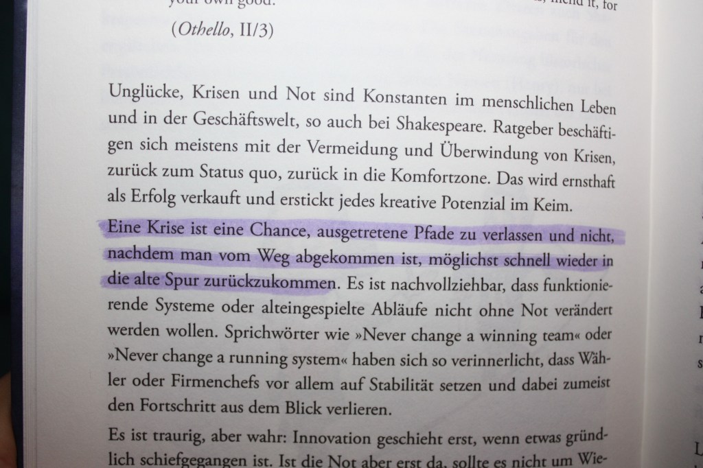 Mein Mann meinte neckisch: „Na bei 13 Wegen wird schon einer zum Erfolg führen.“ Letztlich ist das Buch allerdings kein Ratgeber im klassischen Sinne. Es werden weniger konkrete Handlungsempfehlungen gegeben, sondern Andreas Sturm analysiert verschiedene Werke und Lebensstationen Shakespeares, mit denen er 13 Erfolgsprinzipien begründet. Er schreibt über Lebensweisheiten, die er aus Shakespeares Werken entnommen hat und hat dabei ausgezeichnete Recherchearbeit geleistet. Die Zitate und Situationen sind treffend gewählt.