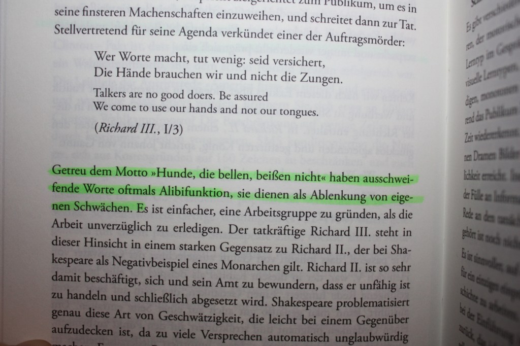 Schön an dem Buch sind die vielen Lebensweisheiten, die tatsächlich noch heute wie die Faust aufs Auge passen. Es lohnt sich, immer wieder das eigene Verhalten und sich selbst aber auch andere zu reflektieren. Das Buch gibt hierfür viele passende Denkanstöße, immer entnommen den Worten des großen Dichters Shakespeare. So heißt es zum Beispiel bei Sturm (grün markiert):