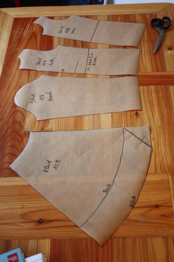 Aus dem Buch von Klimper Klein! „Nähen mit: JERSEY für Kinder (Größe 104-164)“ wählte ich das Skaterkleid in Größe 128 für Maxi aus. Du kannst auch ein anderes einfaches Schnittmuster auswählen, das aus vier Teilen besteht: