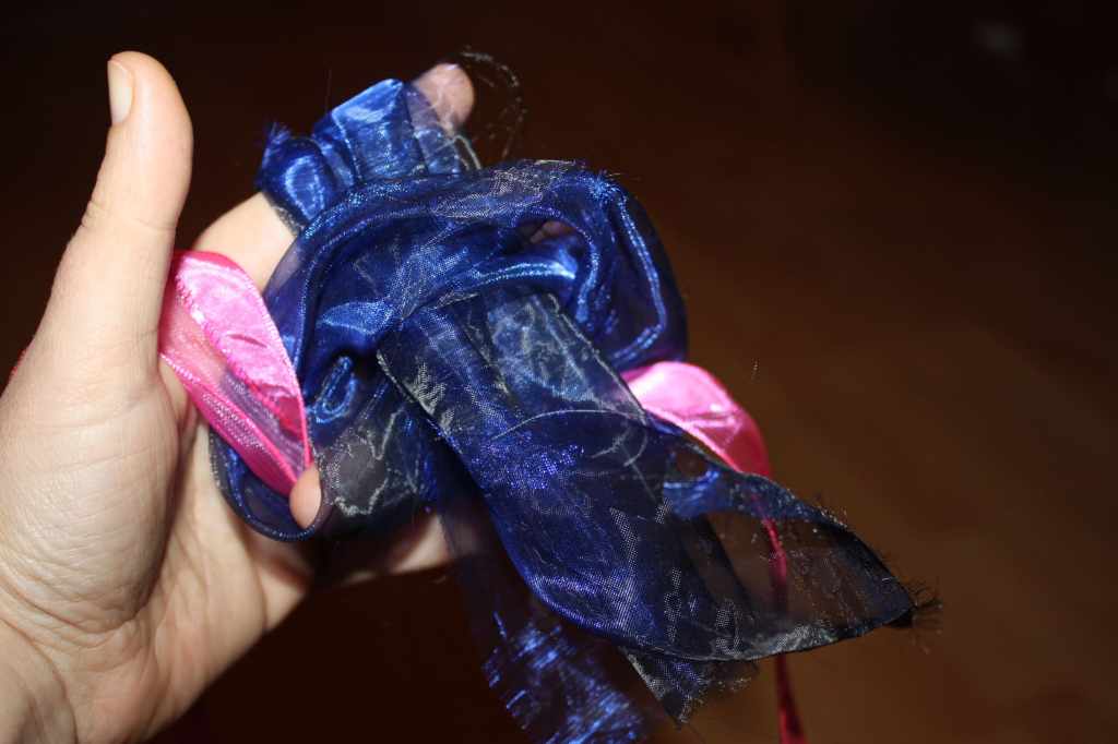 Ich nehme zu dem blauen Tüll noch silbernen hinzu. Auf diese Weise knotest du mehrere Streifen aneinander.