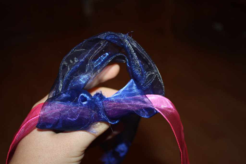 Kannst du es gut erkennen? Du nimmst den Tüll doppelt. Dann legst du das rosafarbene Band über den blauen Tüllstreifen und nimmst die Tüll-Enden von unten über das rosa Band und steckst sie durch die Schlaufe. Festziehen, fertig.