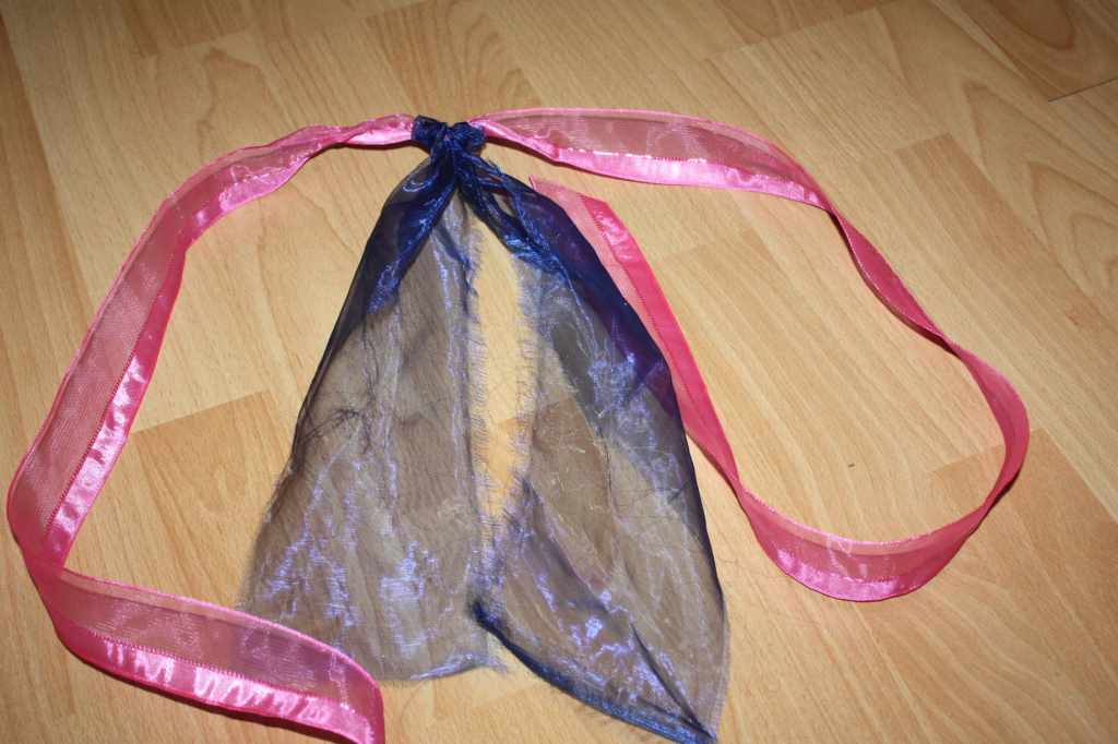 Schneide dir aus Tüll einfache Streifen von etwa 80 cm Länge und 8 cm Breite zurecht. Du brauchst zudem noch ein Band. Um dieses knotest du die Tüllstreifen wie folgt: