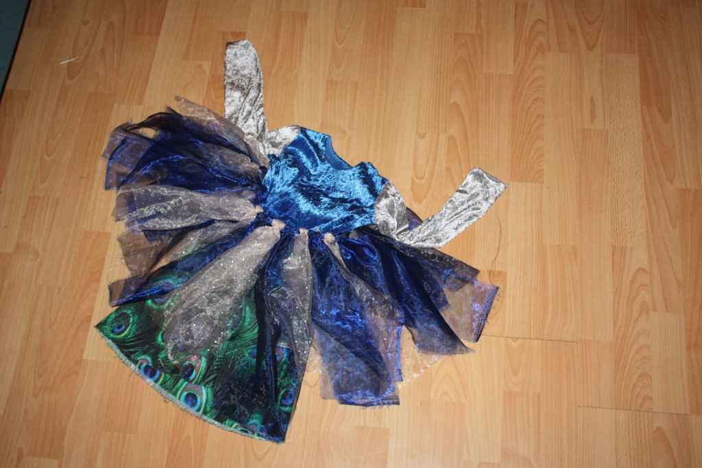 Meine kleine Tochter wünscht sich das Pfauenkostüm in einer schlichteren Variante. Ich nähe das Skaterkleid in Größe 104. Die Ärmel aus silbernem Samt, das Oberteil aus blauem Samt und das Unterteil aus „Pfauenfedern“ (Baumwolle).