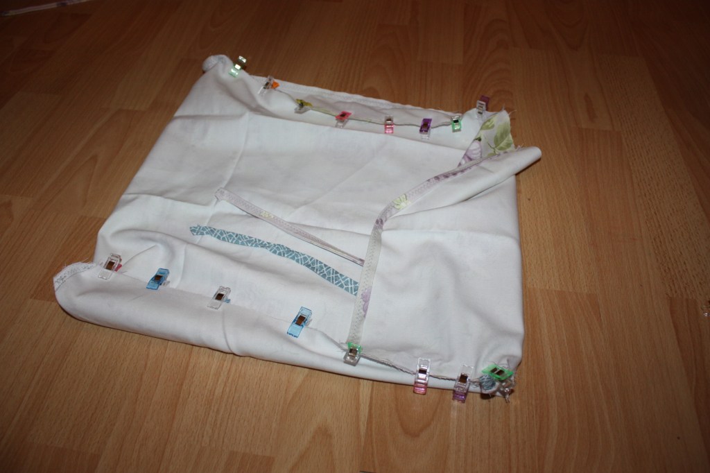 Die Bänder stecke ich dabei an den rechten Ecken fest. Sie liegen innen, da der Bezug im Anschluss gewendet wird.