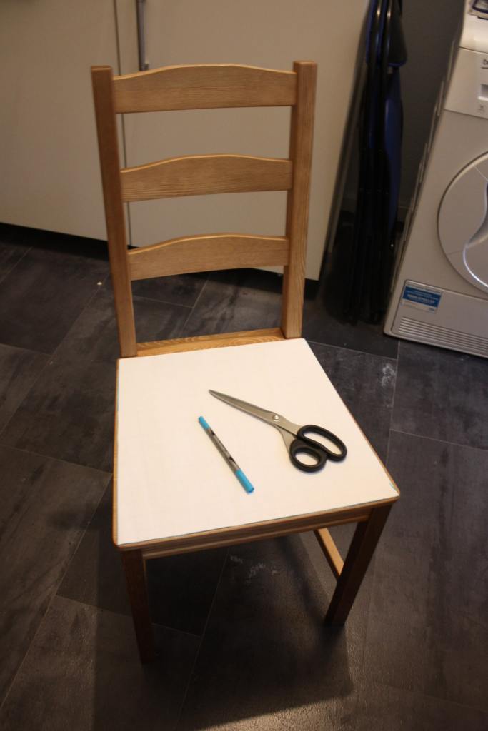 Als Grundlage für den Schnitt nehme ich die Maße des Stuhls. Ungünstiger Weise sind meine neuen Stühle trapezförmig und nicht quadratisch oder zumindest rechteckig, was fürs Nähen eine gewisse Herausforderung bedeutet. Andererseits sollen die Sitzkissen unbedingt die Stuhlform nachahmen.