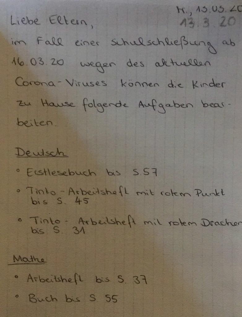 - Homeschooling. Die Lehrerin meiner großen Tochter hat alle Bücher und Übungshefte aus der Schule mit nach Hause gegeben und einen Zettel ins Hausaufgaben gelegt. (Kind: „Ich möchte CD hören, Mama!“) („Mamaaaaaaaam, ich mag CD hören!!!„) Auf diesen stehen die Seitenzahlen, bis zu welchen wir vorarbeiten sollen. Schaffen das die Kinder alleine?
