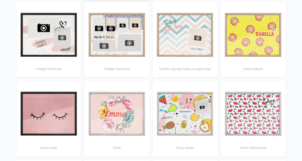 Ich möchte ein großes Acryl-Tablett mit verschiedenen Familienfotos erstellen und bekomme eine Reihe von Designs vorgeschlagen, aus denen ich meinen Favoriten auswählen kann. Hier im Screenshot sieht du 8 Beispiele, es gibt aber noch eine Vielzahl mehr. Ich wähle eine Variante mit 14 Fotos, damit ich seeeehr viele Erinnerungen unterbringen kann.
