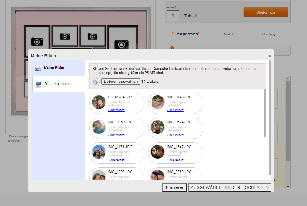 Die Fotos lade ich direkt bei Wanapix im Browser hoch. Das geht flott und nun stehen sie mir auch schon zur Verfügung, um die Collage auf meinem Tablett zu bestücken.