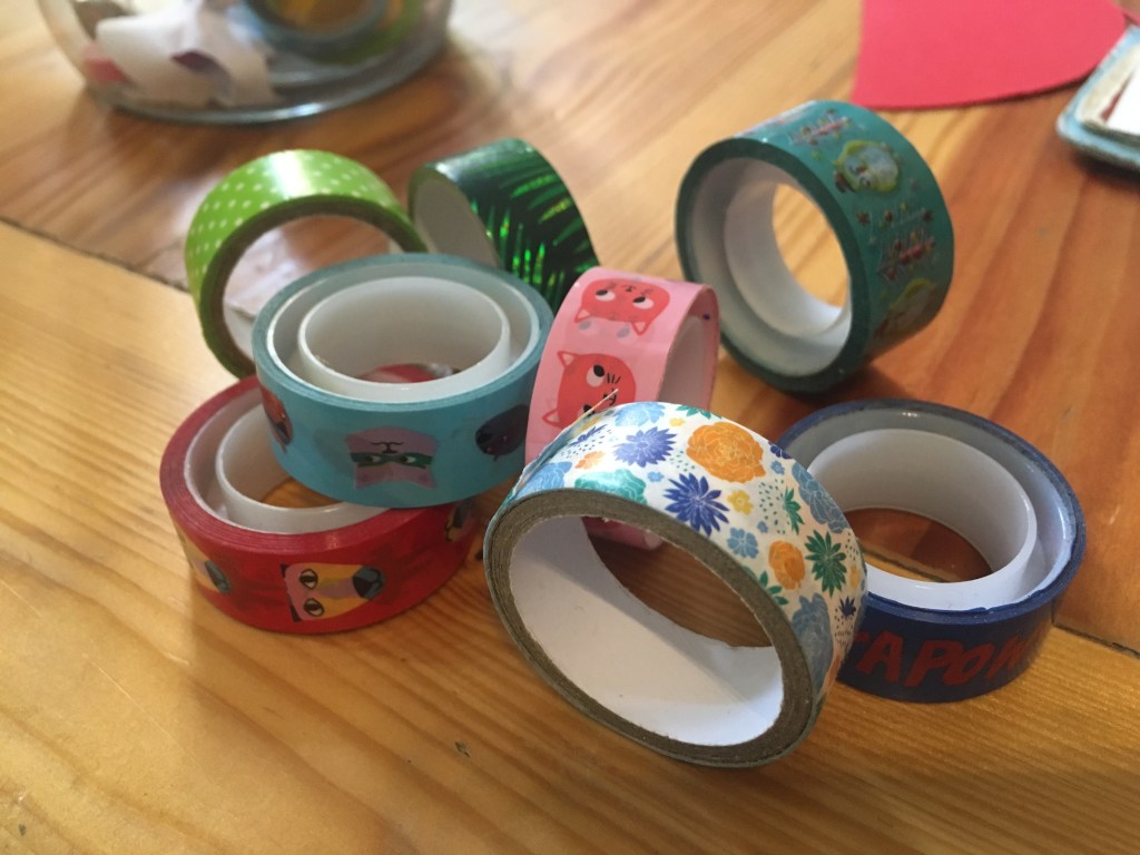Meine Kinder nehmen sich die Klebestreifen natürlich auch zum Basteln: Ostereier können damit beklebt werden, Gläser, Hefte und sogar Stifte. Ich habe sie vor Schulbeginn genutzt, um die Schulsachen meiner Tochter zu markieren (die Buntstifte mit dem grünen Streifen am Ende sind die Stifte meiner Tochter). Die bunten Streifen sind darüber auch einsetzbar zum Verpacken von Geschenken oder zum Gestalten einer Geschenkkarte.