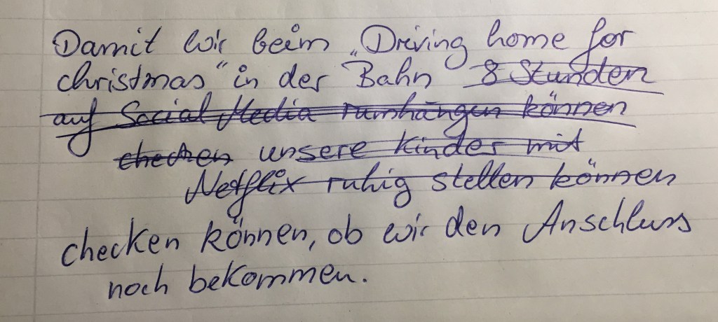 Es wird gefragt, ob wir uns endlich mobiles Internet für dich, mein Smartphone, holen. Damit wir beim „Driving Home for christmas“ in der Bahn 8 Stunden auf Social Media rumhängen können   unsere Kinder mit Netflix ruhig stellen können checken können, ob wir den Anschluss-Zug diesmal erwischen werden.
