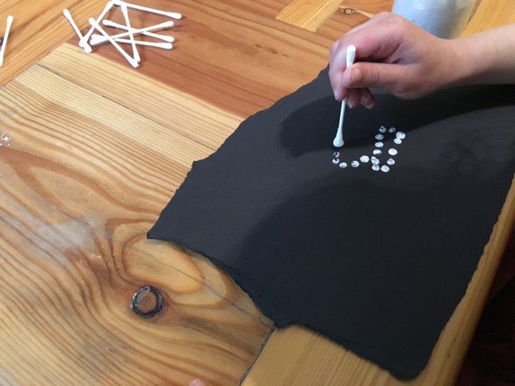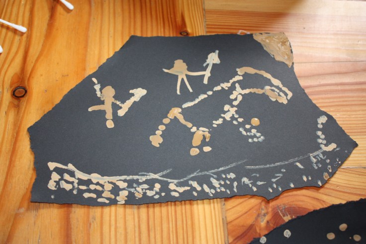 Will sich trotz der frühlinghaften Maitage einfach keine Sonne einstellen, kannst du das Projekt der Höhlenmalerei natürlich auch auf Papier durchführen. Wir mussten heute auch nach drinnen ausweichen, weil uns ein Regenschauer von den Steinen der Elbe vertrieben hat …