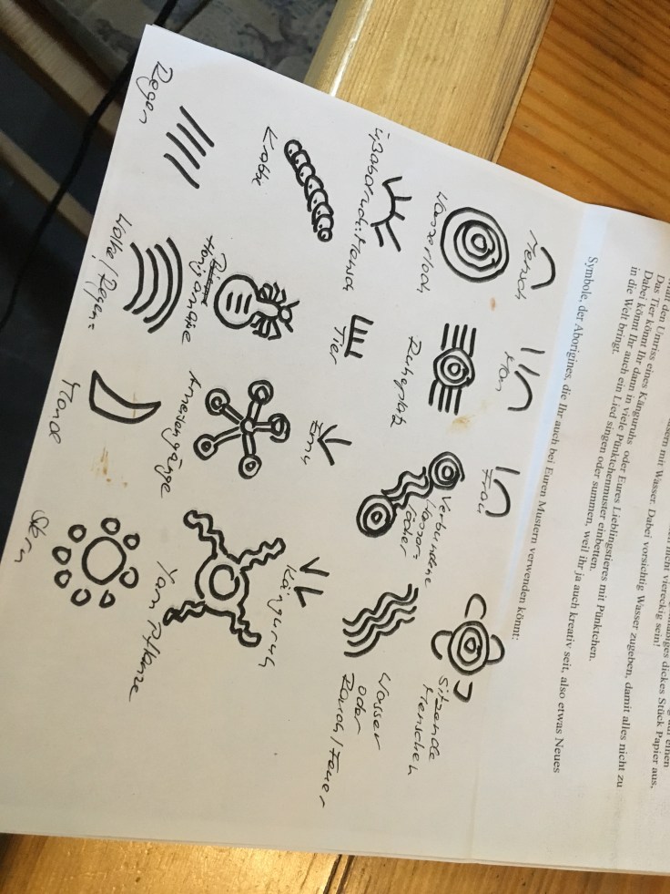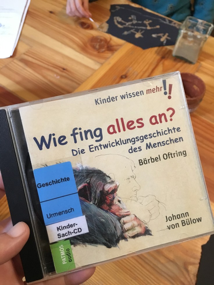 Interessante Kinderbücher über die Steinzeit musst du dir nicht extra kaufen. Leihe sie dir in der Stadtbücherei aus. Bei uns in Dresden kannst du im Moment ohne Covid-19 Test, spontan in der Stadtbibliothek vorbei kommen und hast 30 Minuten Zeit, die passenden Bücher zu finden und auszuleihen. Wir haben uns für zwei Bücher und eine CD entschieden. Informationen zu den Symbolen der Aborigines lagen der „Kunstpost“ bei.