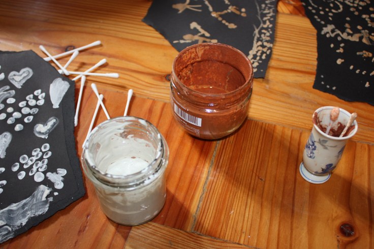 So geht´s: Mische dein Pulver mit etwas Wasser. Nimm nicht zu viel, damit eine dickflüssige Masse entsteht, die gut auf dem Stein deckt. Wir haben drei Ton-Sorten in Gläsern angemischt und mit Ohrenstäbchen auf den Stein getupft – im Stil der Aborigines.