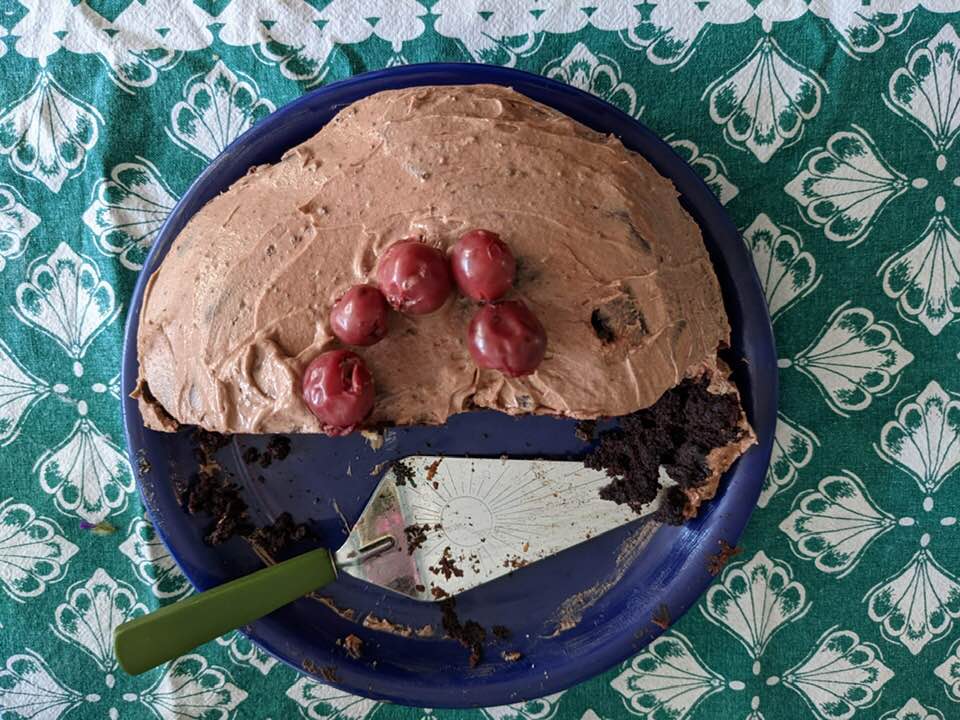 30 – Schoko Kirsch Kuchen: Eine Freundin aus dem Haus hat mir leckeren Schoko Kirsch Kuchen geschenkt. War der lecker!!