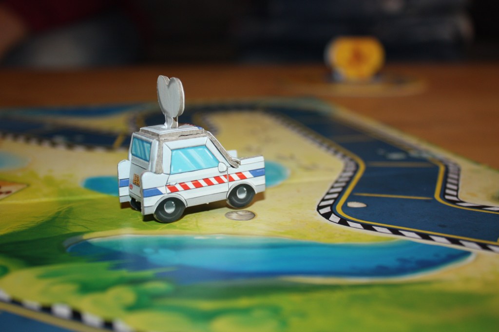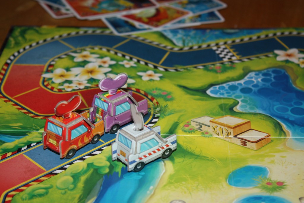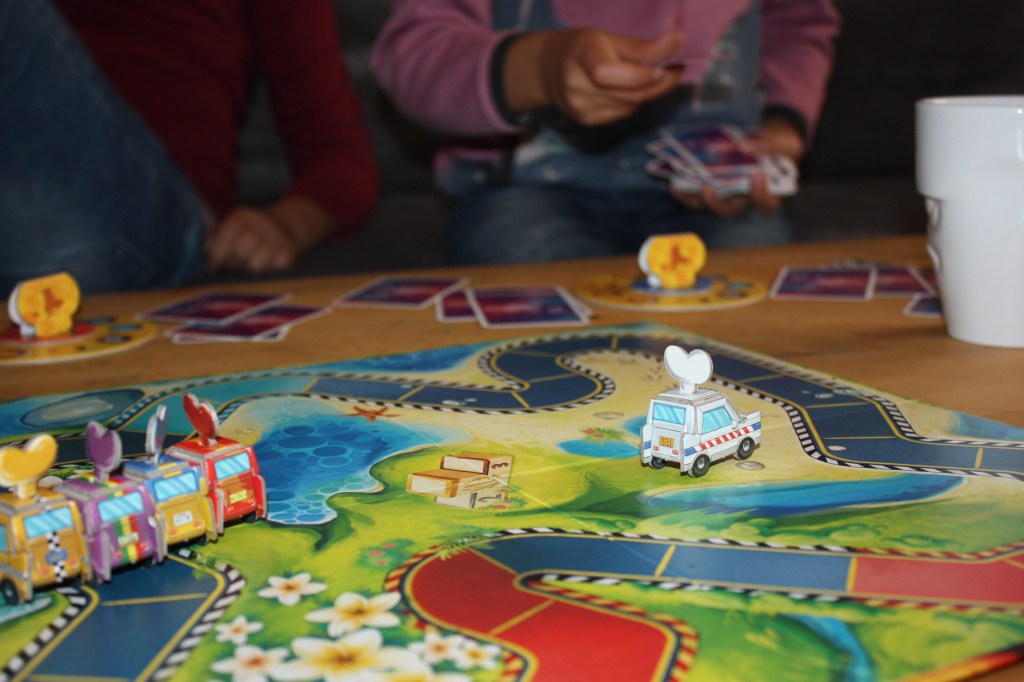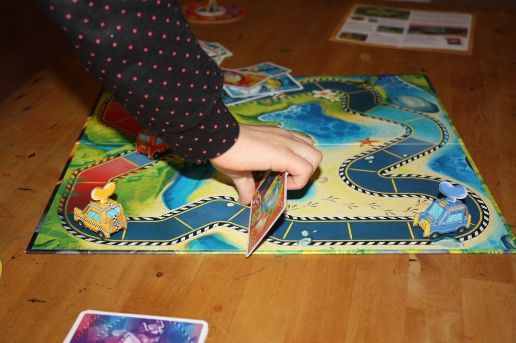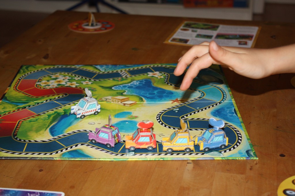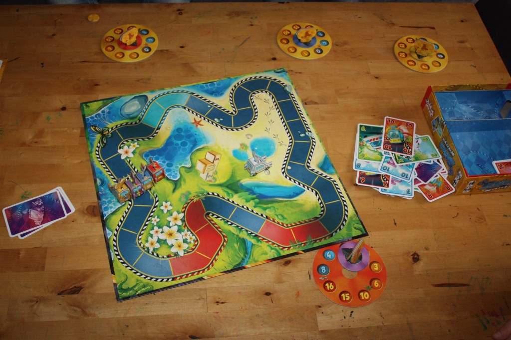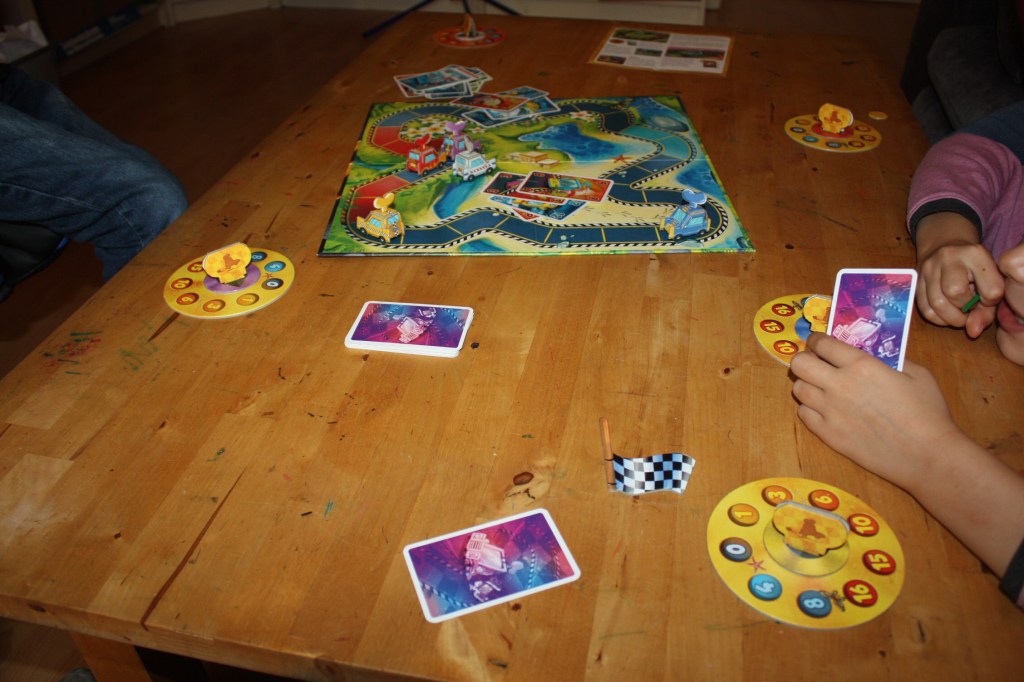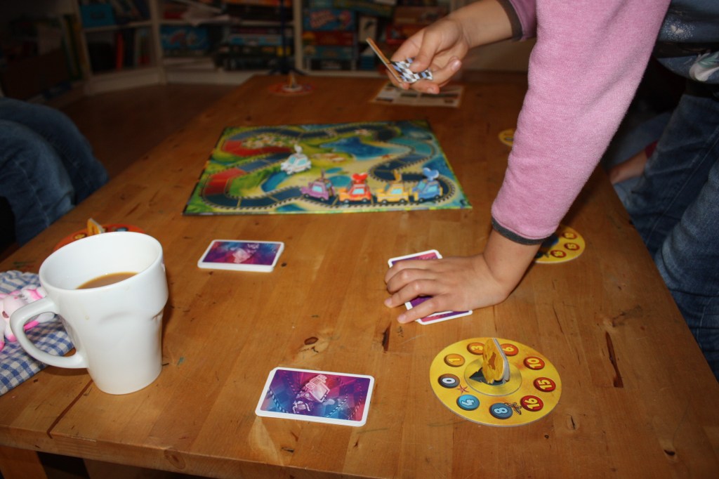 In unseren Runden machten meine Nichte und Maxi in der Regel das Rennen, wenn wir unsere farbenfrohen Autos über die Piste jagen ließen. Während Mini einen Stich nach dem anderen holte und trotzdem nur im Schneckentempo vorwärts kam, hielt ich mich bewusst hinten und zog meinen Motor auf. Ich wollte am Ende nochmal richtig Gas geben können, was nur so halb klappte. Die Mischung macht´s bei diesem Spiel aus, das hatten die großen Kinder intuitiv raus.