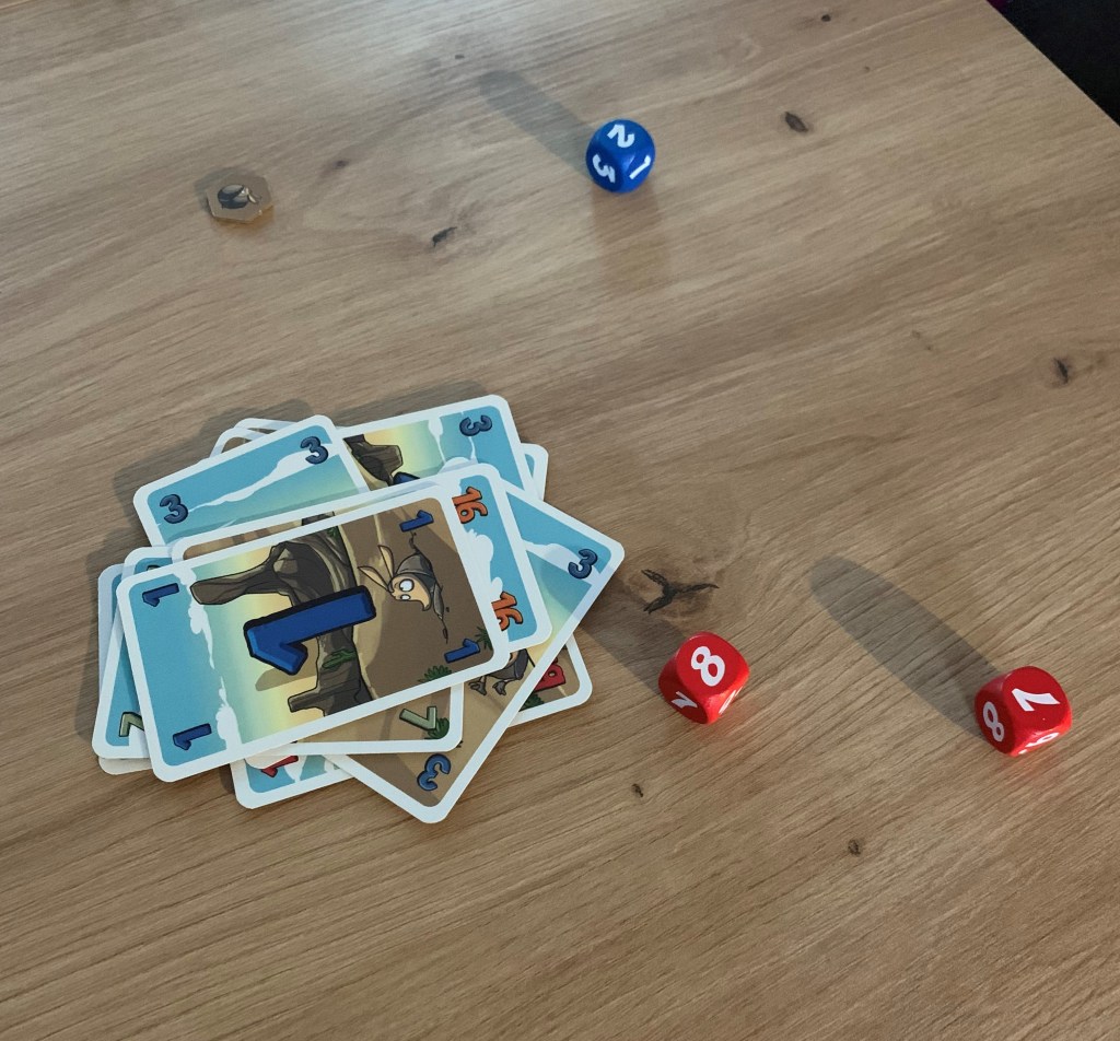 Es stellte sich in mehreren Spielen heraus, dass meine Kinder Trittbrettfahrer sind, wenn es um große Kartenwerte geht. Klar: die niedrigen Nummern kann man leichter vorhersagen. Eine 1, 2 oder 3 lässt sich nur mit dem blauen Würfel würfeln. Da sind die Kinder auf der sicheren Seite. Was die großen Zahlen angeht, werfen sie ihre Karten lieber dann ab, wenn ich diese Zahlen gewürfelt habe. Ich sag´s ja: es sind Trittbrettfahrer.