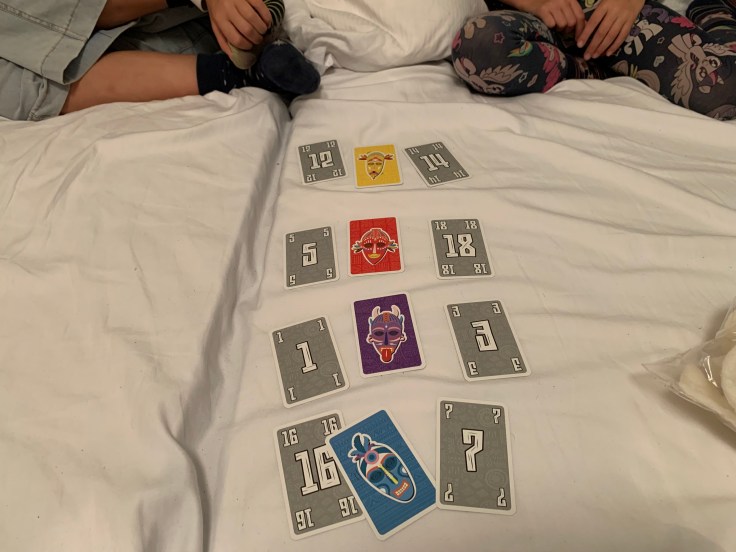 Wir spielten Cabanga! in unseren Herbstferien, darunter auch im Hotelzimmer in Görlitz. Davon stammt das Bild auf dem Bett. Ihr seht: Man braucht für das Kartenspiel etwas Platz, aber im Grunde kann man es überall spielen und es stellte sich als perfekter Zeitvertreib heraus. Auch jetzt nach den Ferien macht es besonders an den regnerischen Tagen Spaß, an denen wir drinnen festsitzen.