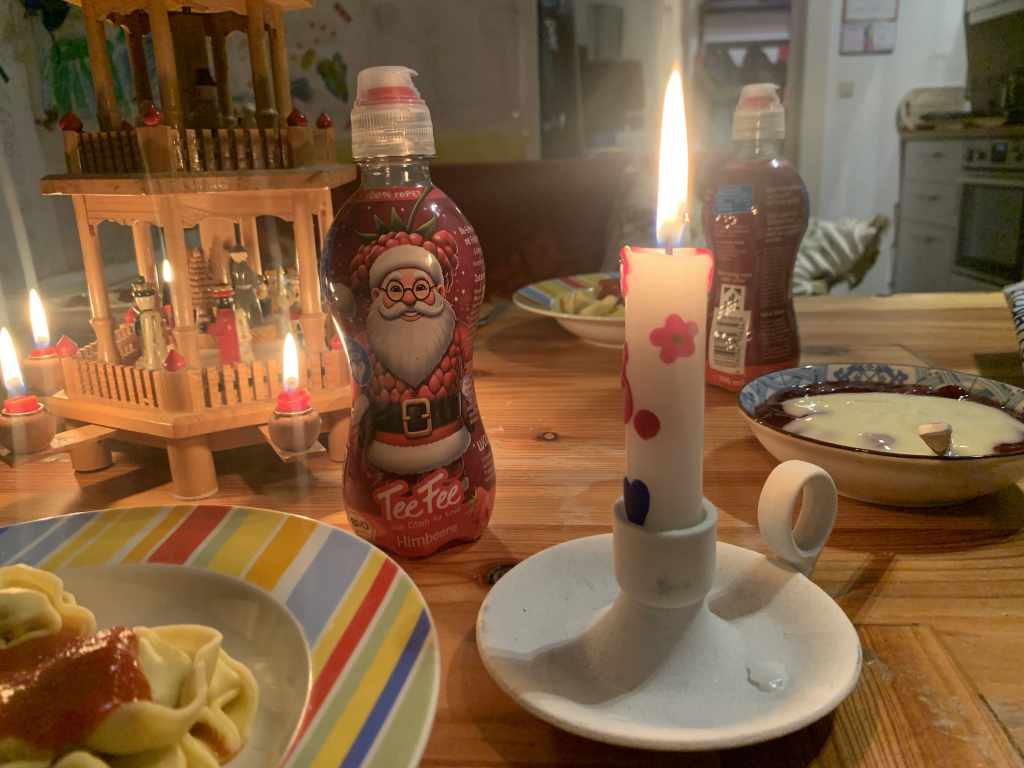 Seit Oktober steht bei uns bereits die Weihnachtspyramide auf dem Fensterbrett und wandert beim Essen auch hin und wieder auf den Tisch. Kerzen werden angezündet und dann dürfen meine Mädels ihre Tee+Saft-Getränke trinken.
