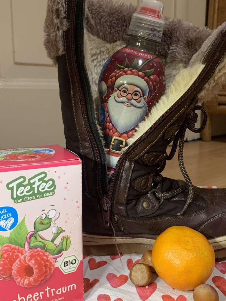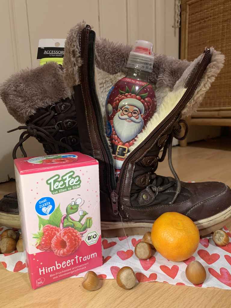 Besonders gut passt eine Flasche der limitierten Weihnachtsedition des Bio-Erfrischungsgetränks in den Stiefel (Früchtetee-Aufguss mit Himbeergeschmack). So kann man Niklaus auch mal zuckerfrei genießen! Und ich finde, dass die Flasche rein optisch an einen Schoko-Weihnachtsmann erinnert. Obwohl es keine Weihnachtssüßigkeit ist, wirkt die Flasche durch das Design sehr weihnachtlich und spricht Kinder an.