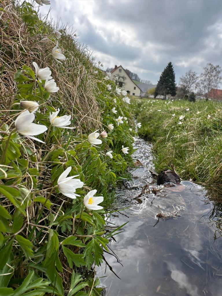 Von der Grenze aus ist die restliche Wanderung sehr entspannt. Der Weg führt bergab ins Tal, vorbei an einigen Obstbäumen und bald folgt noch ein kleines Bächlein dem Weg ins Dorf hinein. Rings herum von Buschwindröschen umgeben. Es war so idyllisch, dass ich auch davon ein Foto machen musste.