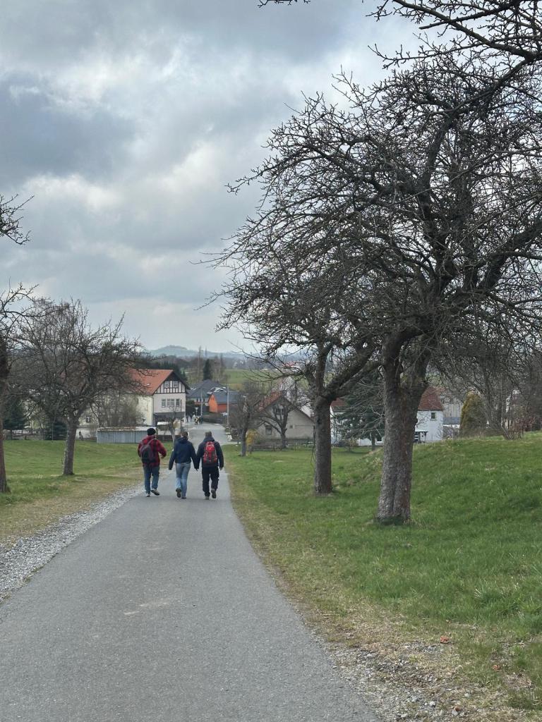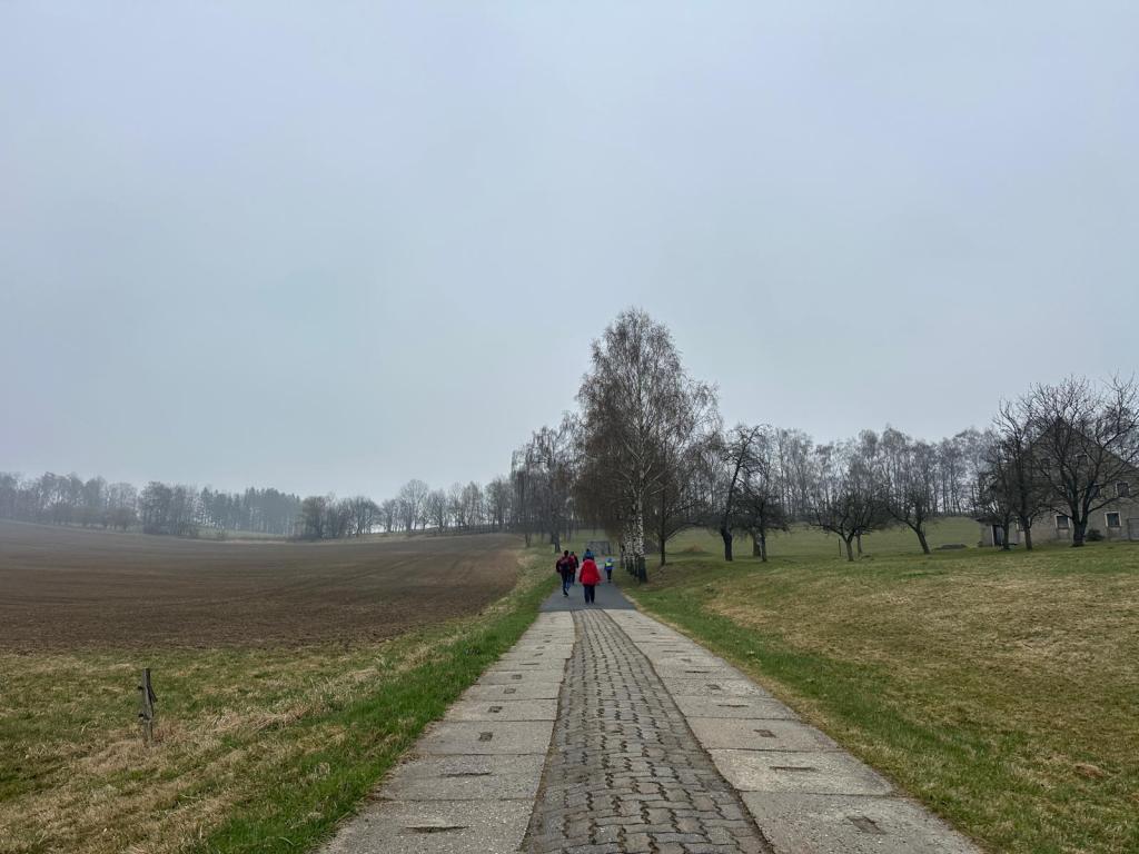 Die Dorfstraße führte uns heraus aus dem Dorf. Dabei zieht sich die Straße eine Weile, da Langburkersdorf seinem Namen alle Ehre macht. Oft werden wir oben mit einer schönen Aussicht belohnt. Ostern 2026 wickelte sich das Dorf allerdings in eine dichte Nebeldecke ein. Der Blick reichte daher nur bis zum Feld direkt zu meinen Füßen. (Ihr müsst einfach selbst mal vorbeischauen, wenn der Himmel klar ist!)